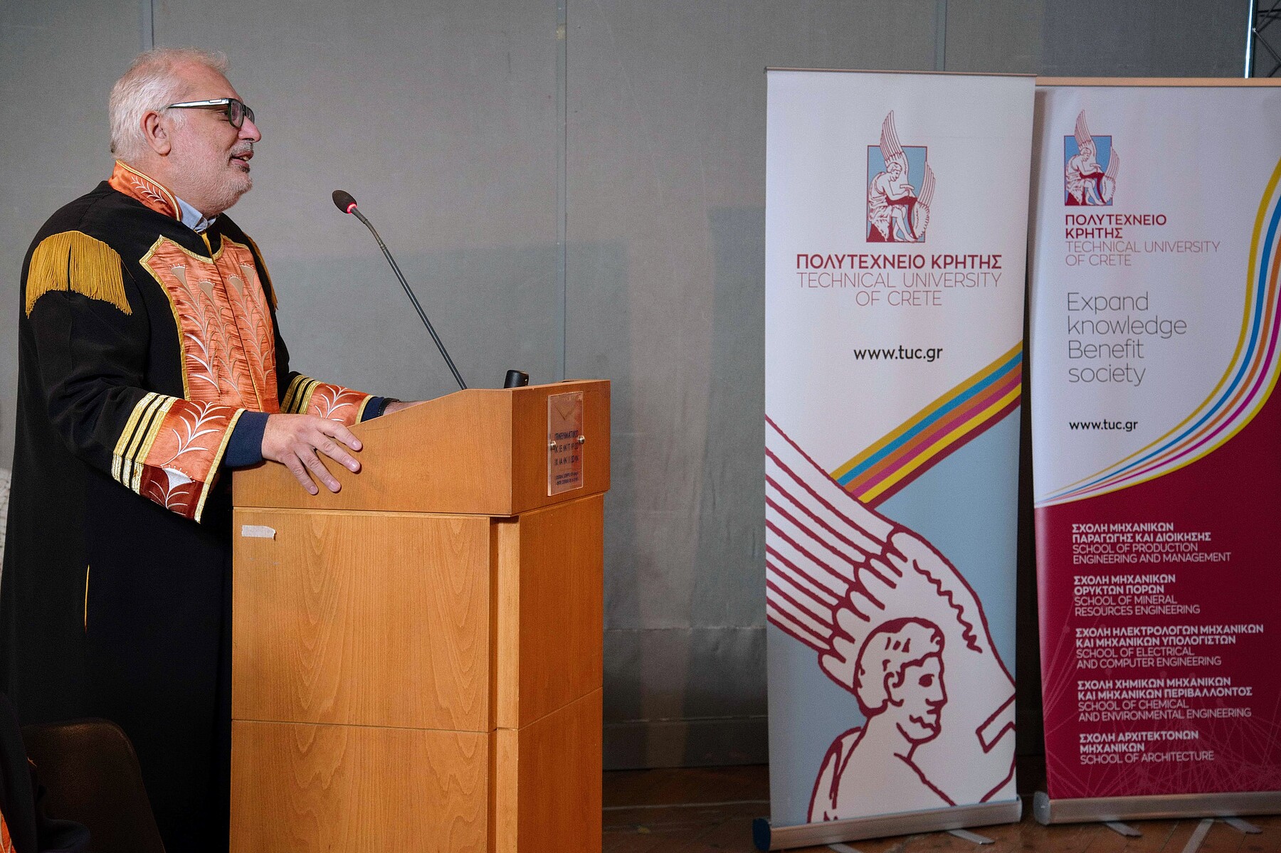 «Σήμερα είναι μια από τις σημαντικότερες ημέρες του Πολυτεχνείου Κρήτης. Είναι μια συγκινητική στιγμή για εσάς, για όλες τις προσπάθειες που έχετε κάνει, αλλά και για τις οικογένειές σας, που σας στήριξαν. Είναι μια στιγμή, που θα πρότεινα να αναλογιστείτε πώς φτάσατε μέχρι εδώ, πώς εισαχθήκατε στο Πολυτεχνείο Κρήτης, τί όνειρα και ανησυχίες είχατε, πώς εξελιχθήκατε, πώς ωριμάσατε. Είναι η κρίσιμη στιγμή, που χειραφετείστε και ανοίγετε τα φτερά σας. Είστε Μηχανικοί και ως Μηχανικοί έχετε τη δυνατότητα να προσφέρετε και να παρέμβετε άμεσα στην καθημερινότητα, στον άνθρωπο, στην κοινωνία. Όλες οι ειδικότητες Μηχανικών έχουν άμεση σχέση με την εξέλιξη της κοινωνίας στο μέλλον. Σας ζητώ να γίνετε η καλύτερη εκδοχή του εαυτού σας, να έχετε οράματα και να επιδιώξετε να τα πετύχετε για ένα καλύτερο μέλλον, που εσείς θα καθορίσετε. Ευχόμαστε να σας καμαρώνουμε και η πορεία σας να γίνει πρότυπο για τους νέους φοιτητές που έρχονται. Πάντα θα ανήκετε στο Πολυτεχνείο Κρήτης και γι' αυτό θέλουμε να βρίσκεστε κοντά μας, να μαθαίνουμε για την πορεία και να είμαστε υπερήφανοι για τα επιτεύγματά σας.