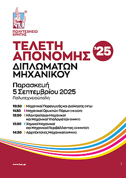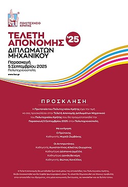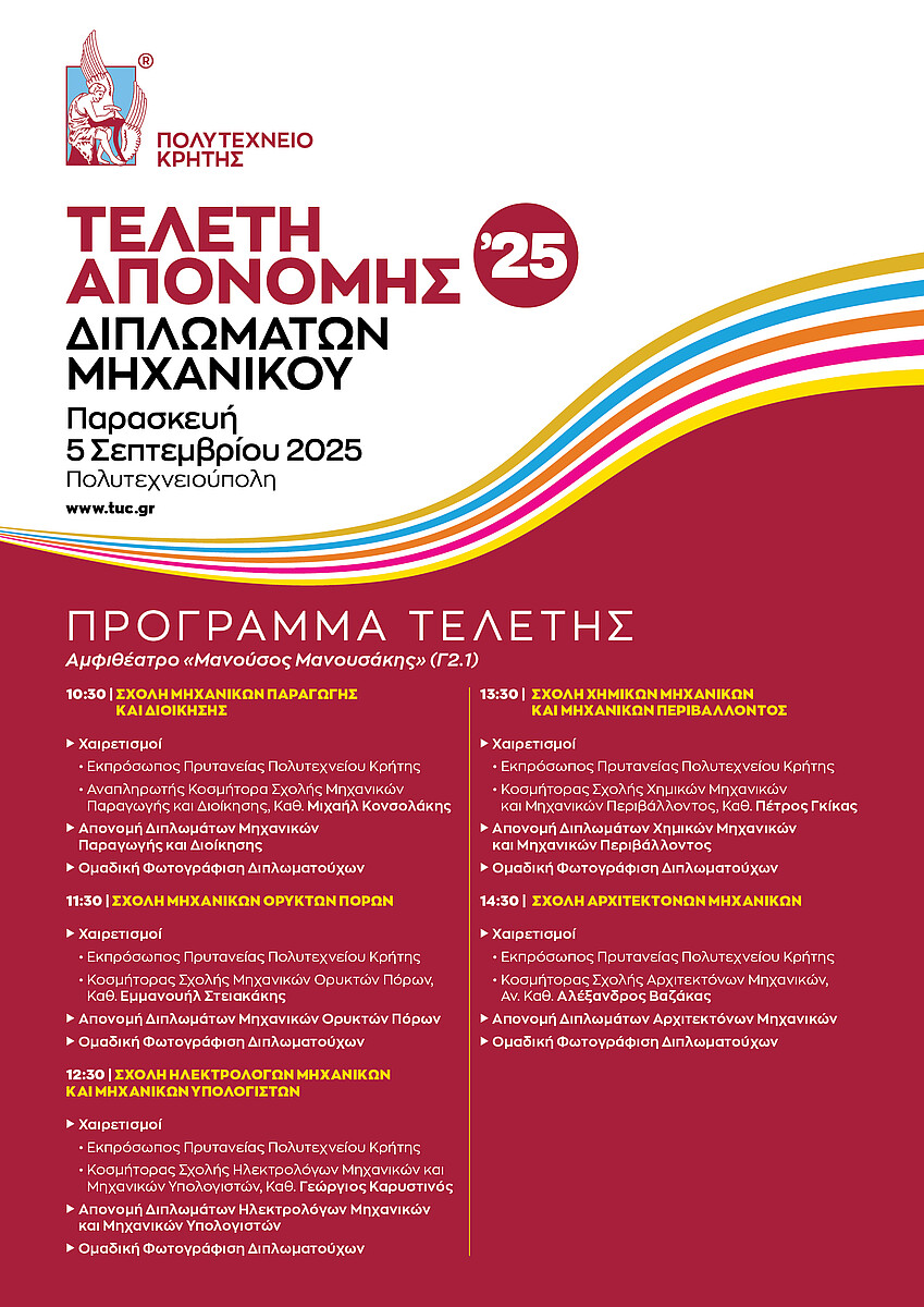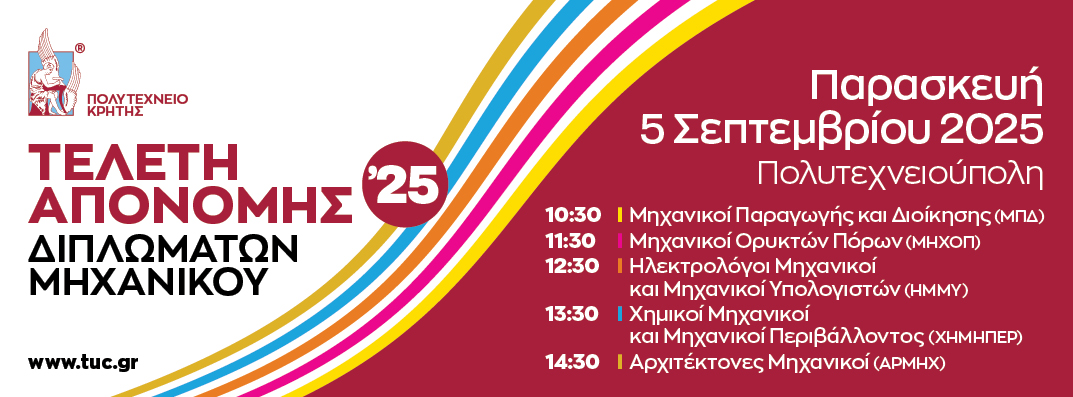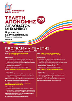 Η Τελετή Απονομής Διπλωμάτων Μηχανικού του Πολυτεχνείου Κρήτης για την ανακήρυξη της εξεταστικής του εαρινού εξαμήνου 2024-2025, θα πραγματοποιηθεί την Παρασκευή 5 Σεπτεμβρίου 2025, στο Αμφιθέατρο “Μανούσος Μανουσάκης” (Γ2.1) στην Πολυτεχνειούπολη.
