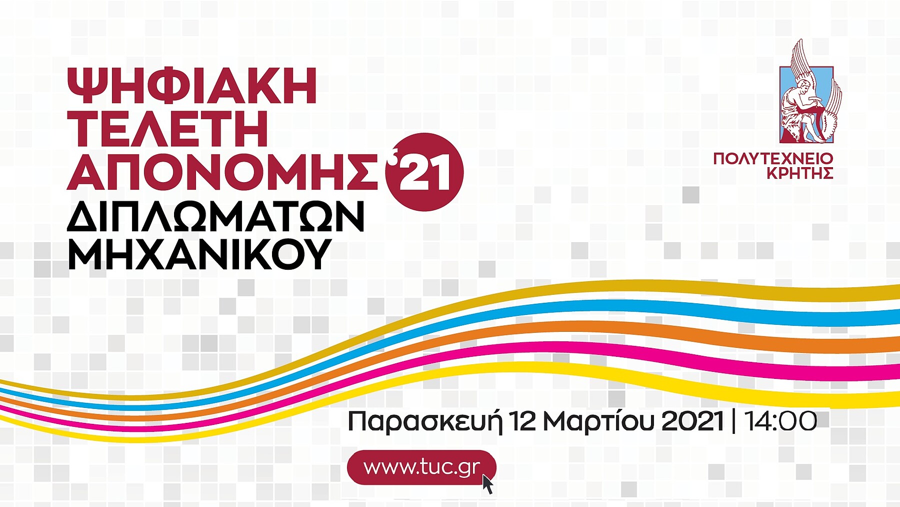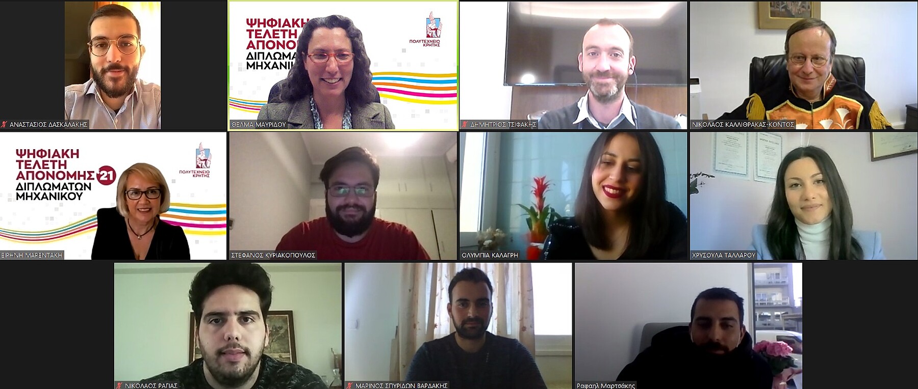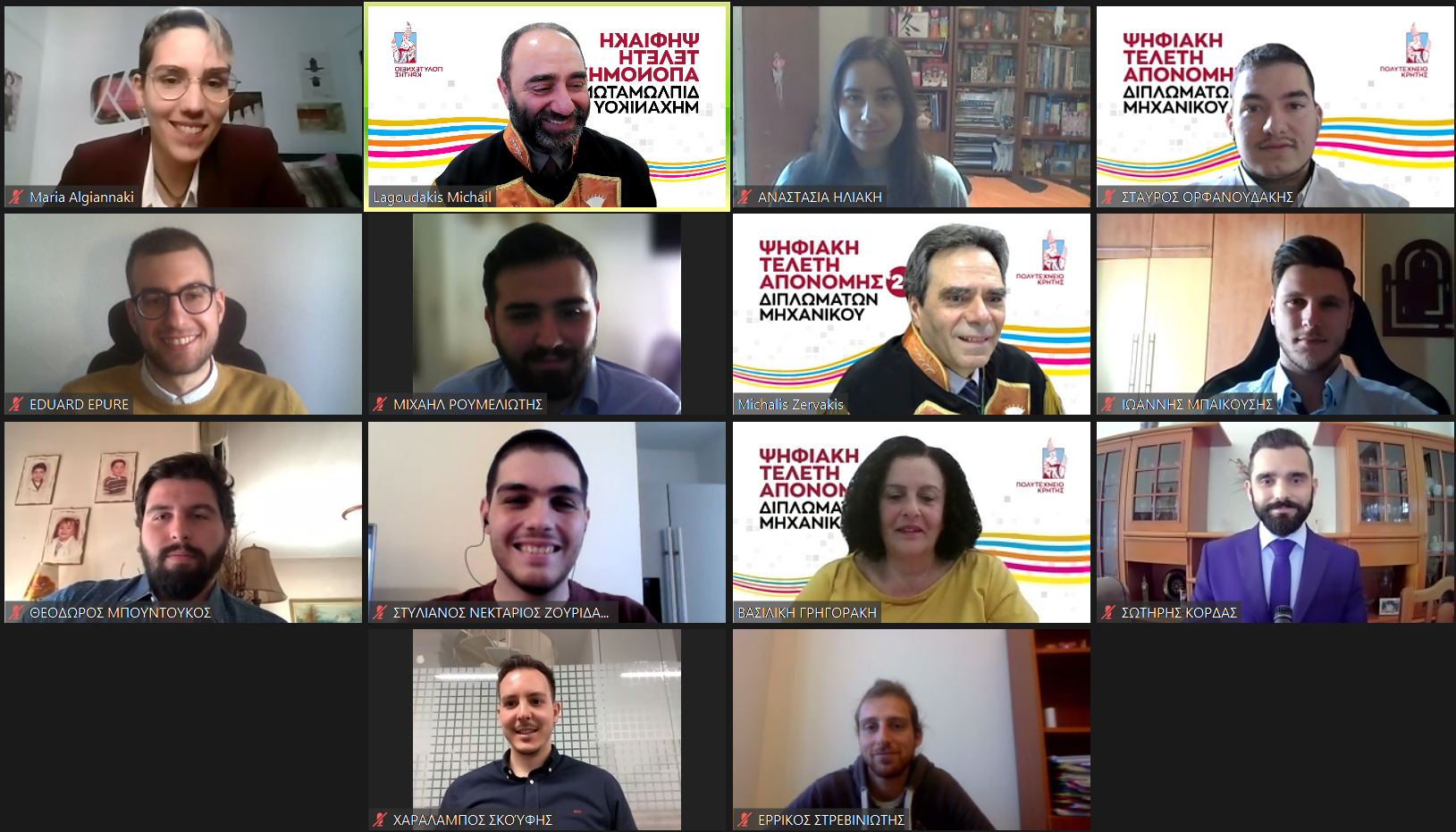 Η πλειονότητα των 112 νέων αποφοίτων Μηχανικών των πέντε Σχολών του Πολυτεχνείου Κρήτης από την ανακήρυξη του χειμερινού εξαμήνου 2020-2021 συμμετείχε ενεργά στην Ψηφιακή Τελετή Απονομής Διπλωμάτων Μηχανικού που πραγματοποιήθηκε με τηλεδιάσκεψη την Παρασκευή 12 Mαρτίου 2021, ενώ η ζωντανή μετάδοση της Τελετής μέσω της επίσημης σελίδας του Ιδρύματος στο facebook ξεπέρασε τις 3.000 θεάσεις, με περισσότερες από 200 ευχές και σχόλια αγάπης και συγκίνησης, από συγγενείς και φίλους προς τους νέους Μηχανικούς!