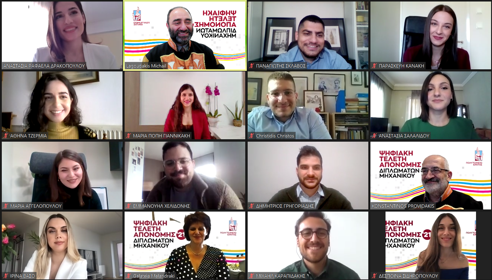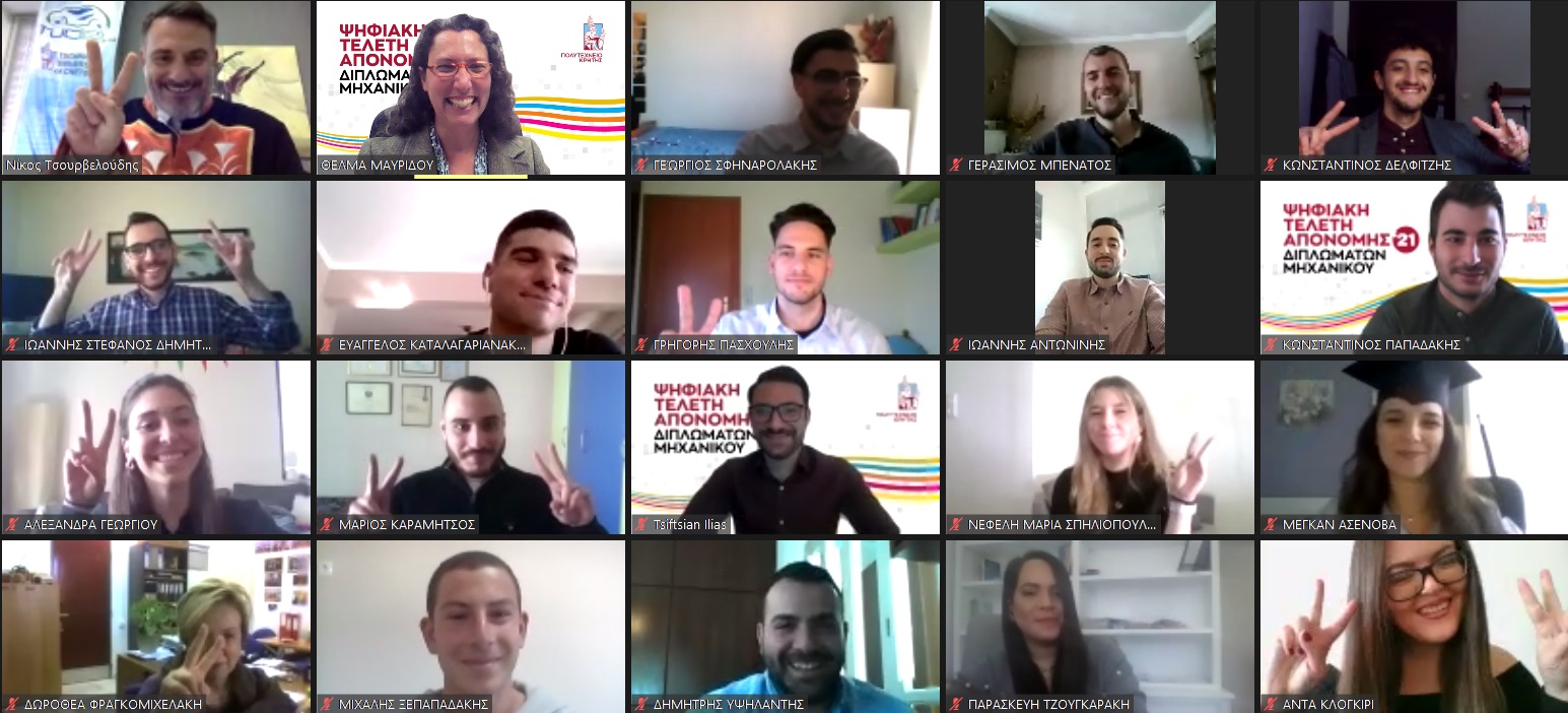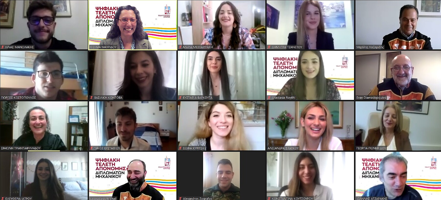 Η πλειονότητα των 112 νέων αποφοίτων Μηχανικών των πέντε Σχολών του Πολυτεχνείου Κρήτης από την ανακήρυξη του χειμερινού εξαμήνου 2020-2021 συμμετείχε ενεργά στην Ψηφιακή Τελετή Απονομής Διπλωμάτων Μηχανικού που πραγματοποιήθηκε με τηλεδιάσκεψη την Παρασκευή 12 Mαρτίου 2021, ενώ η ζωντανή μετάδοση της Τελετής μέσω της επίσημης σελίδας του Ιδρύματος στο facebook ξεπέρασε τις 3.000 θεάσεις, με περισσότερες από 200 ευχές και σχόλια αγάπης και συγκίνησης, από συγγενείς και φίλους προς τους νέους Μηχανικούς!