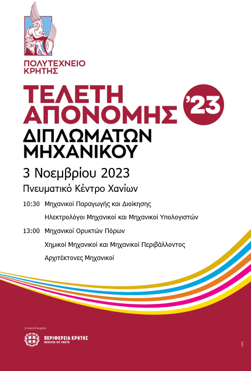 Σε κλίμα χαράς και συγκίνησης πραγματοποιήθηκε η Τελετή Απονομής Διπλωμάτων Μηχανικού του Πολυτεχνείου Κρήτης για την ανακήρυξη της επαναληπτικής εξεταστικής και οι βραβεύσεις φοιτητών και αποφοίτων του ακαδημαϊκού έτους 2022-2023, την Παρασκευή 3 Νοεμβρίου 2023, στο Πνευματικό Κέντρο Χανίων.