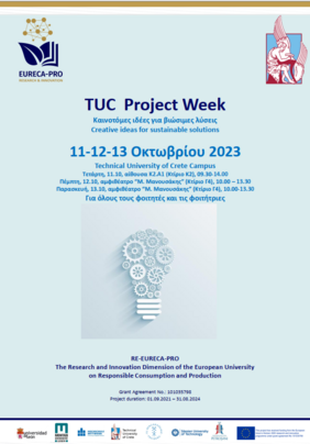 Στο πλαίσιο του ευρωπαϊκού έργου για την καινοτομία και έρευνα στη βιώσιμη παραγωγή και κατανάλωση RE-EURECA PRO, με επιστημονικά υπεύθυνο του Καθηγητή και Πρύτανη του Πολυτεχνείου Κρήτης Μιχαήλ Ζερβάκη, διοργανώνεται τριήμερο ανοιχτό για συμμετοχή σε όλους τους φοιτητές και φοιτήτριες με τίτλο “The Re-EURECA PRO Project Week at the Technical University of Crete - Καινοτόμες ιδέες για βιώσιμες λύσεις”.
