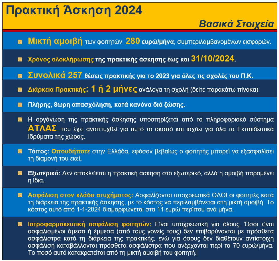 * Επισημαίνεται ότι από το επόμενο ακαδημαϊκό έτος 2025-2026, οι φοιτητές ΜΠΔ μετά την ένταξη νέου μαθήματος πρακτικής άσκησης στο Προπτυχιακό Πρόγραμμα Σπουδών τους, θα μπορούν να επιλέγουν την υλοποίηση πρακτικής άσκησης 2 ή 3 μηνών. Αντίστοιχα, οι φοιτητές ΜΗΧΟΠ, θα μπορούν να πραγματοποιούν και προαιρετική πρακτική άσκηση διάρκειας 1 μήνα. Τα παραπάνω αφορούν την υλοποίηση ασκήσεων από τον Σεπτέμβριο του 2025 και μετά.