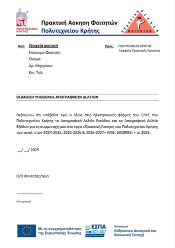- Βεβαίωση Συμπλήρωσης Απογραφικών Δελτίων, για όσους η πρακτική χρηματοδοτήθηκε από πρόγραμμα του ΕΣΠΑ