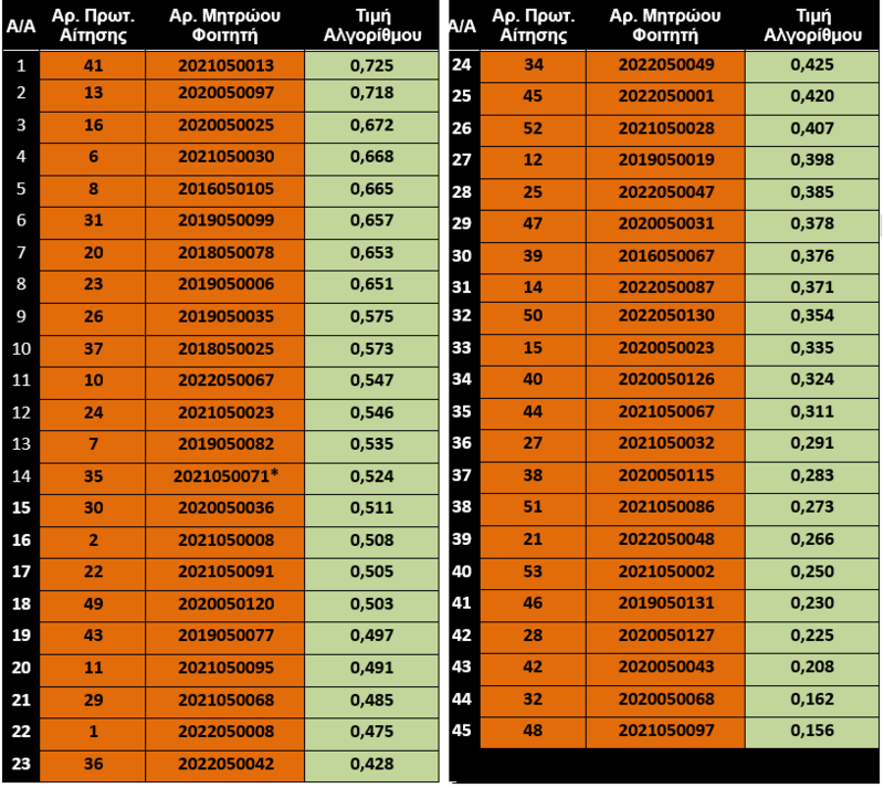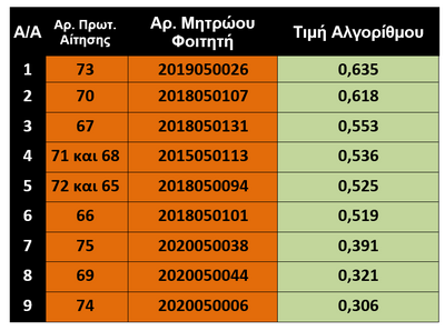 Στον Πίνακα που ακολουθεί παρουσιάζεται η λίστα με τις εγκεκριμένες αιτήσεις, ταξινομημένες με φθίνοντα τιμή του αλγορίθμου της Β’ Ομάδας Κριτηρίων, χωρίς να λαμβάνεται υπόψη ο συντελεστής ευπαθούς ομάδας, αφού όλες οι αιτήσεις γίνονται δεκτές.