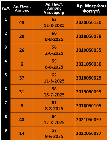 Μετά την οριστικοποίηση των αποτελεσμάτων και με νεότερη δήλωσή τους απέσυραν την αίτηση τους οι φοιτητές των οποίων ο Αριθμός Μητρώου περιλαμβάνεται στον πίνακα που ακολουθεί.