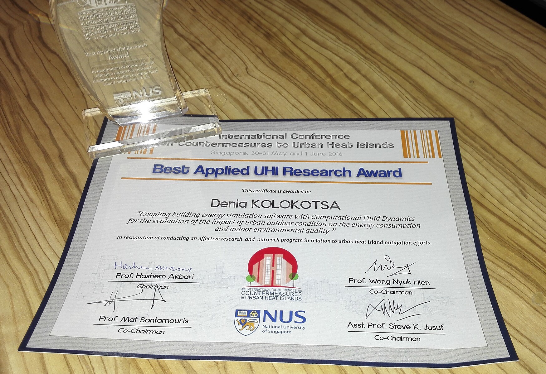 The article entitled: ¨Coupling building energy simulation software with Computational Fluid Dynamics for the evaluation of the impact of urban outdoor conditions on the energy consumption and indoor environmental quality¨ submitted by the Energy Management in the Built Environment Research Lab (EMBER) with authors Kostas Gobakis and Denia Kolokotsa received the Best applied Urban Heat Island research award at the 4th International Conference on Countermeasure to Urban Heat Islands and climate change through mitigation and adaptation that was held in Singapore 31 May-1 June 2016.
