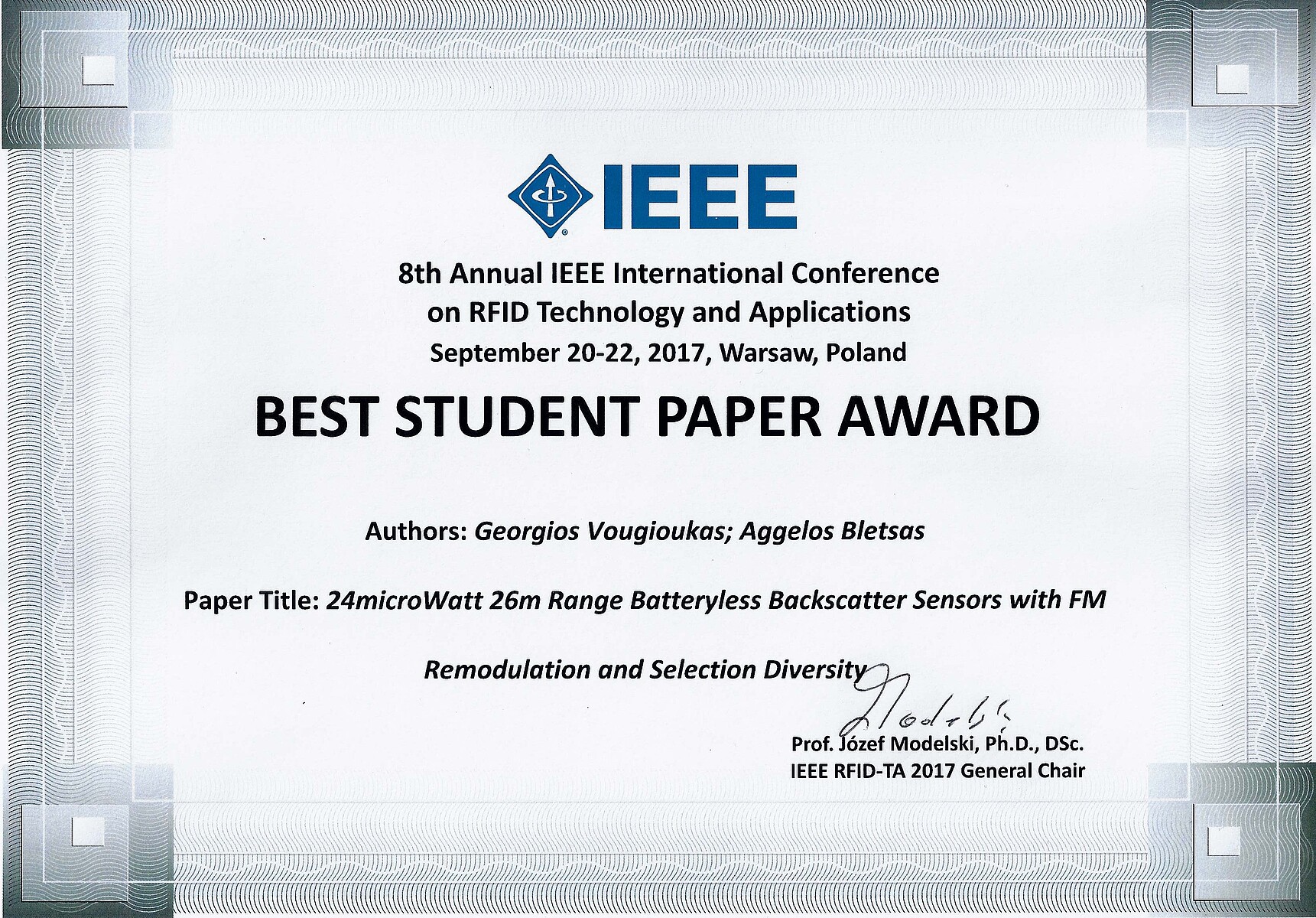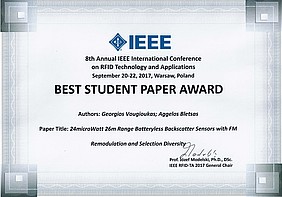 George Vougioukas, Ph.D. candidate at the School of Electrical & Computer Engineering (ECE) of TUC, received the single Best Student Paper Award at the 8th annual IEEE International Conference on RFID Technology & Applications (RFID-TA), Warsaw, Poland for the paper:
