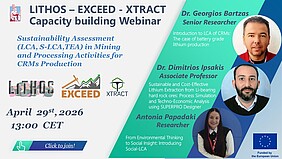 The HE projects LITHOS, EXCEED and XTRACT are co-organizing a capacity-building webinar on April 29 at 13:00 CET focusing on “Sustainability Assessment, (Life Cycle Assessment (LCA), Social Life Cycle Assessment (S-LCA) and Techno Economical Assessment (TEA) in mining and processing activities for critical raw materials (CRMs) production”.