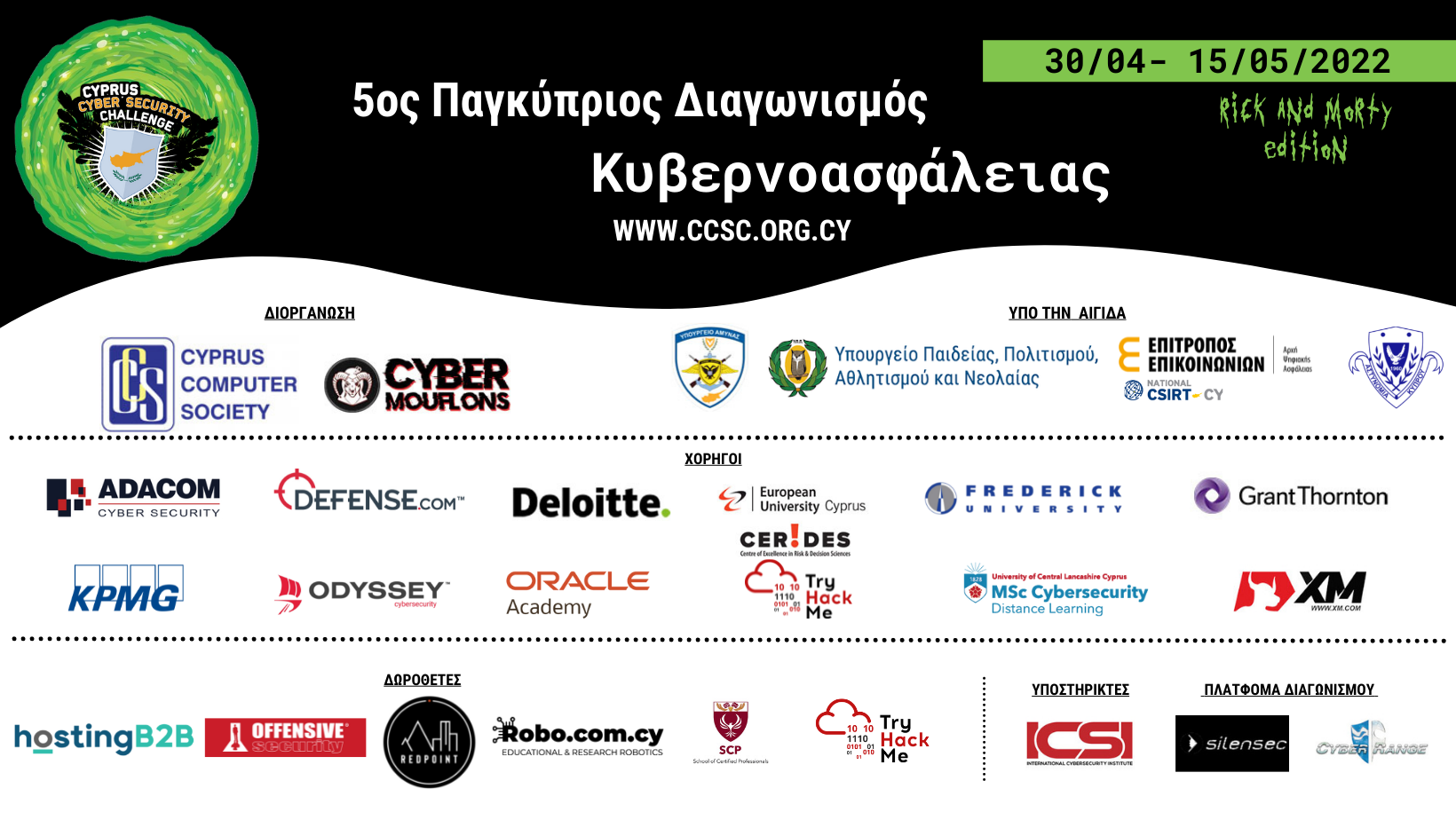 The organization of CCSC 2022 was under the auspices of the Cyprus Ministry of Defense, the Ministry of Education, Culture, Sport and Youth, the Cyprus Police and the Digital Security Authority via the office of the Communications Commissioner of Cyprus. The sponsors of the event were: Adacom Cyber Security, Defense.com, Deloitte, European University Cyprus, Exness, Frederick University, Grant Thornton, KPMG, Odyssey Cybersecurity, Oracle Academy, Try Hack Me, University of Central Lancaster Cyprus and XM as well as the supporters ΗostingB2B, MVPS.net, ICSI, Offensive Security, RedPoint, Robo Cy and SCP Academy, Silensec, Cyber Ranges.
