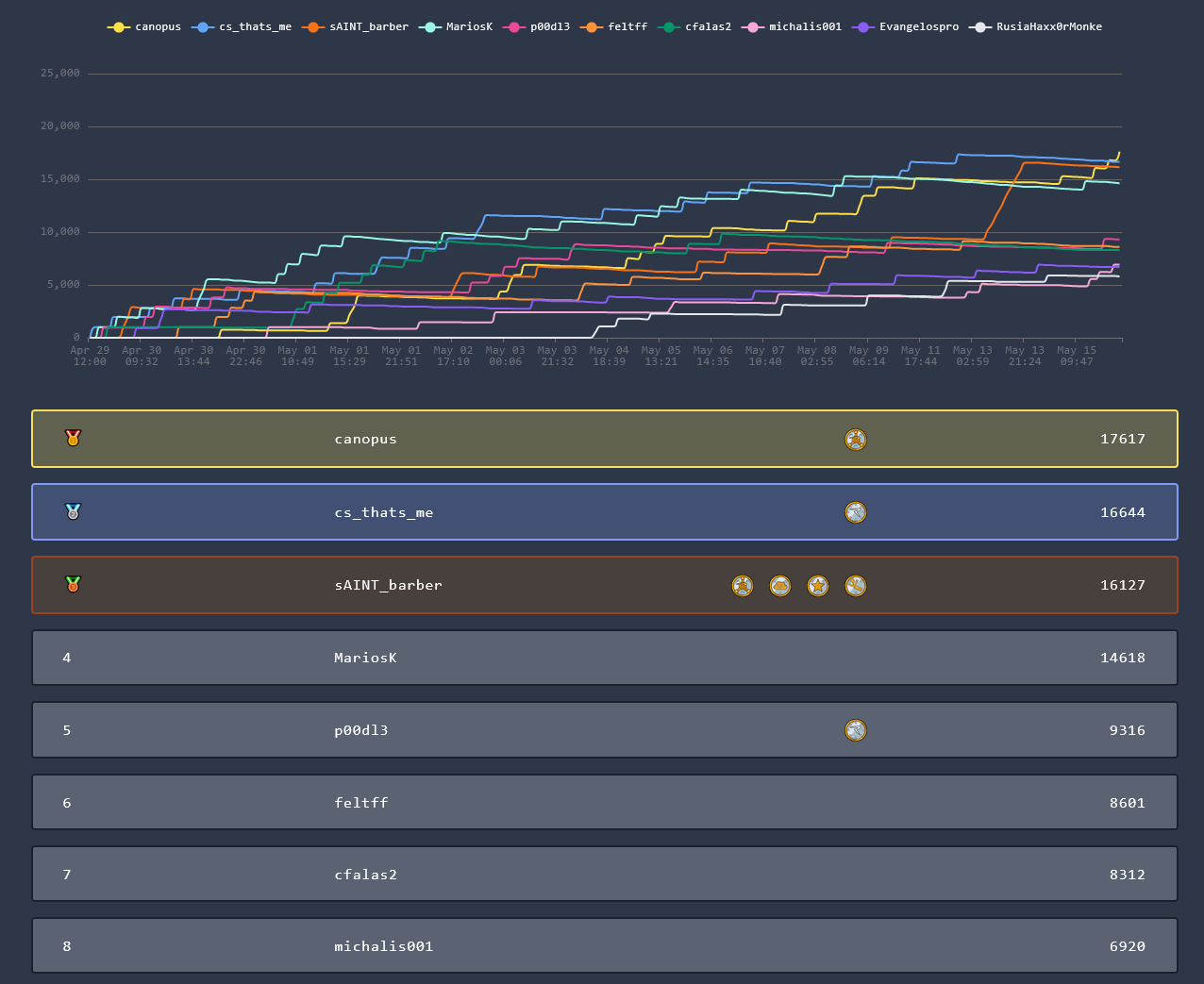 As it can be seen on the detailed scoreboard of the competition, Canopus by Odysseas Stavrou resolved 24 out of 42 challenges, more than any other participant, and gathered 17,617 points, literally surpassing just before the finish line (on the final day) the two opponents who finally took the 2nd and the 3rd place respectively.