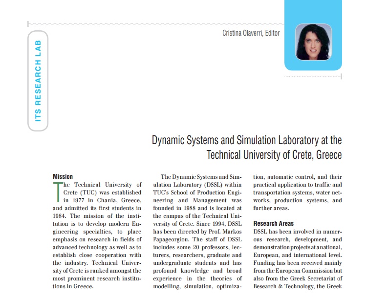 IEEE Intelligent Transportation Systems Magazine publishes a tribute article at the fall 2015 issue, describing the history and the activities of the Dynamic Systems and Simulation Laboratory at the School of Production Engineering and Management of TUC.