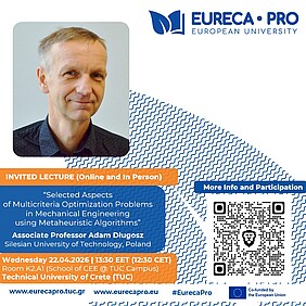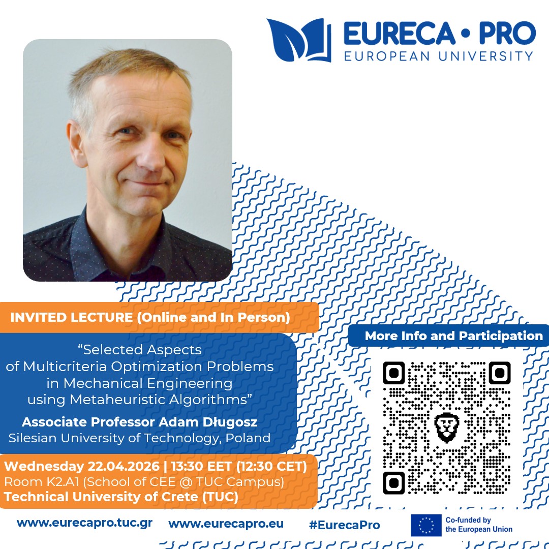 The next lecture of the series will be delivered by Dr. Adam Długosz, Associate Professor at the Department of Computational Mechanics and Engineering, Faculty of Mechanical Engineering, Silesian University of Technology (SUT), Poland, one of the partner universities in EURECA-PRO. Dr. Długosz will be visiting TUC for the whole week starting the 20th of April 2026, meeting members of TUC Faculty and Staff. Dr. Długosz is visiting TUC with the support of EURECA-PRO TUC.