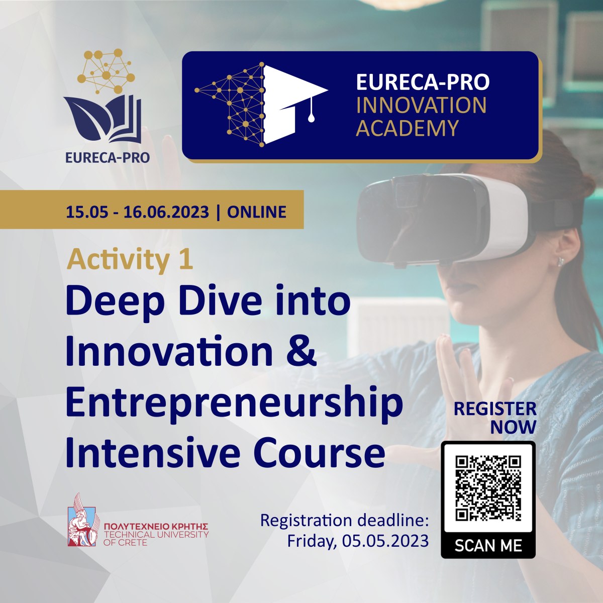 On Friday June 9, 2023 at 17:00 you are invited to the Online Open Event that will conclude the Deep Dive into Innovation & Entrepreneurship Intensive Course, offered as part of the EURECA-PRO Innovation & Entrepreneurship Programme at the Technical University of Crete (TUC). During the event, the participants of the course will have the chance to share the business ideas they developed within the course in the form of a Pitch Deck presentation and receive feedback from the live audience. At the end of the event, the participating audience will vote for the best project and the winning team or individual will receive a special award from TUC!