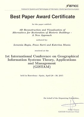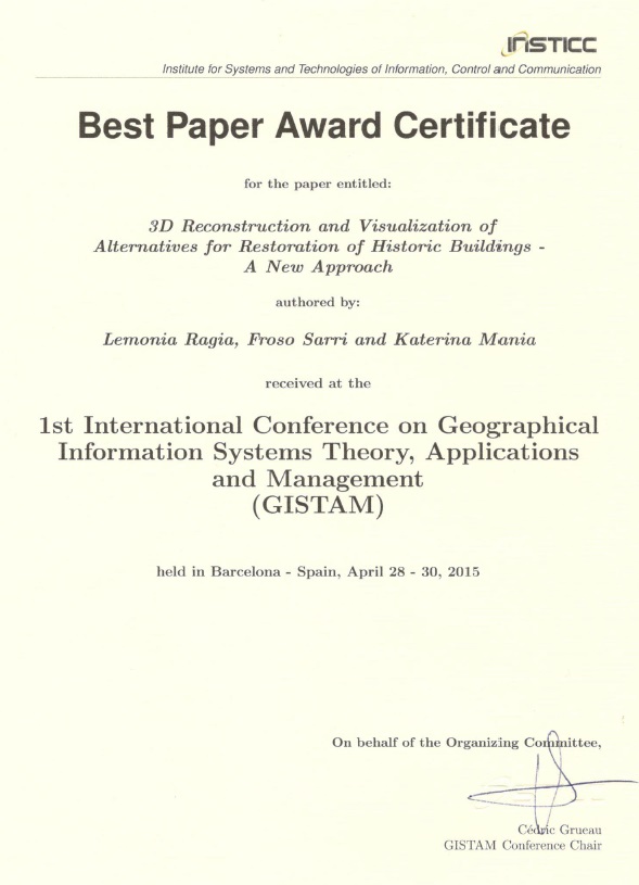 Τhe paper «3D Reconstruction and Visualization of Alternatives for Restoration of Historic Buildings: a New Approach» was awarded for the GISTAM 2015 Best Paper Award. Lemonia Ragia (scientific associate at TUC), Froso Sarri (student at the ECE School of TUC) and Katerina Mania (Associate Professor, ECE School of TUC) , are the authors of the paper.
