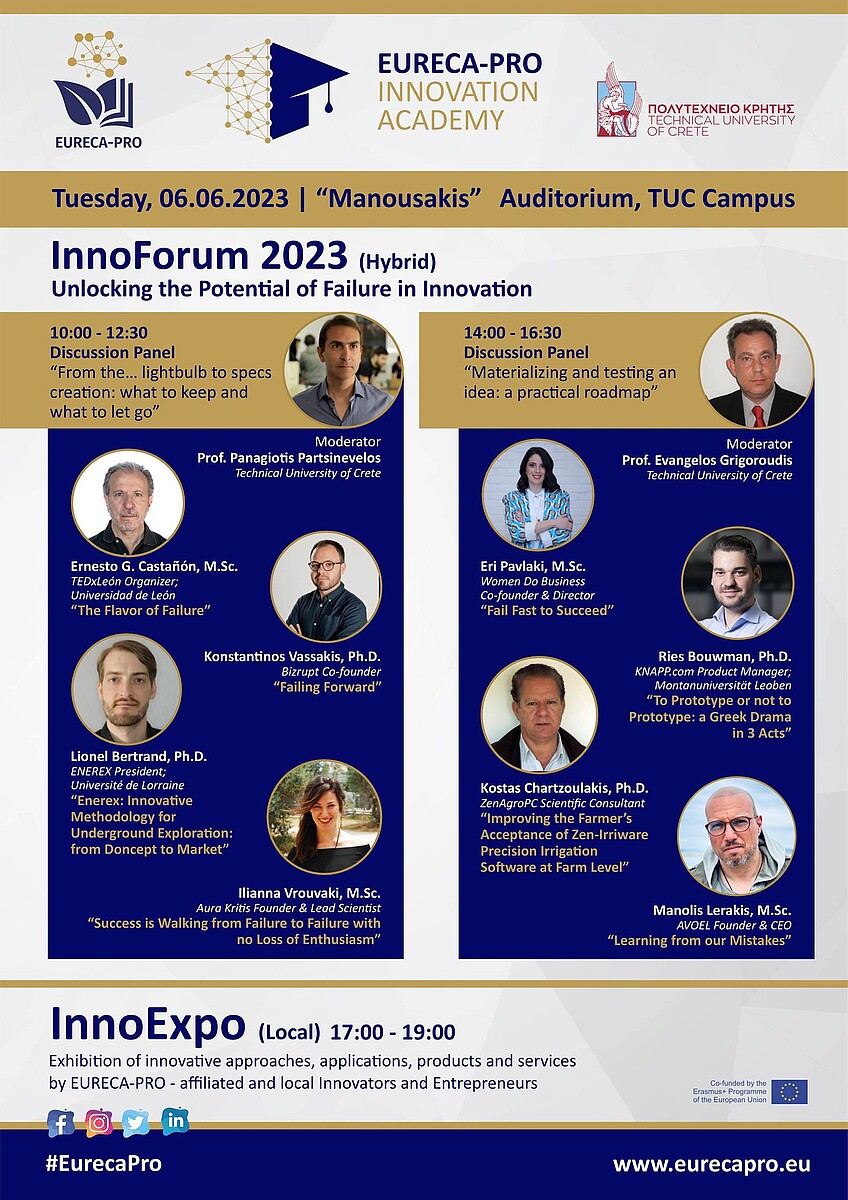 as a lively, interpersonal stage to exchange ideas and share experiences in innovation and entrepreneurship (I&E) among established, as well as young and aspiring, innovators from the EURECA-PRO Universities and the local community. The event will be offered in a hybrid format, with the invited speakers presenting in person in front of a live audience at TUC Campus, while the EURECA-PRO partners and anyone interested will attend remotely.