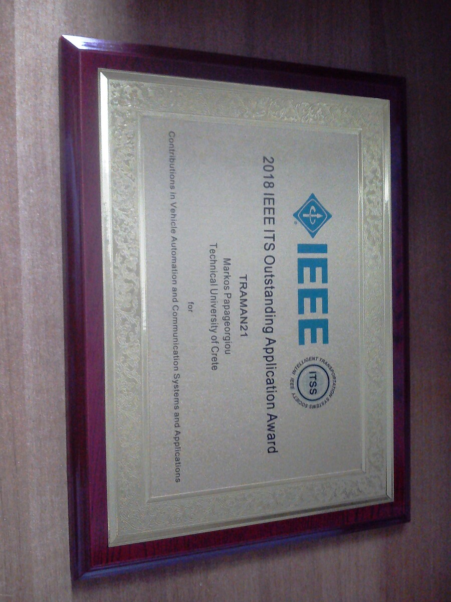 - Prof. Markos Papageorgiou and the TRAMAN21 Team received the 2018 Outstanding ITS Application Award from the IEEE Intelligent Transportation Systems Society for their contributions to "Vehicle Automation and Communication Systems and Applications". The project TRAMAN21 was completed at DSSL and was funded by an ERC Advanced Grant (2013-1018). The award was presented to Assoc. Prof. Ioannis Papamichail during the award ceremony of the 21st IEEE International Conference on Intelligent Transportation Systems, Maui, Hawaii, USA, November 4-7, 2018.