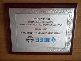- Dr. Maria Kontorinaki, a former PhD student within TRAMAN21 and now a Lecturer at the University of Malta, received the 2nd Prize for the Best PhD Dissertation Award 2018 from the IEEE Intelligent Transportation Systems Society for her doctoral dissertation "Advanced Nonlinear Control Concepts for Freeway Traffic Networks". The award was presented at the same conference as above.