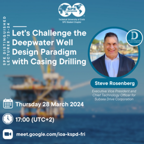 The SPE Student Chapter of Technical University of Crete would like to invite you to the upcoming talk of Mr.Steve Rosenberg, Executive Vice President and Chief Technology Officer for Subsea Drive Corporation. The topic of the event is «Let's Challenge the Deepwater Well Design Paradigm with Casing Drilling». This online event will be held on Thursday 28 March 2024 at 17:00 EET (UTC+2).