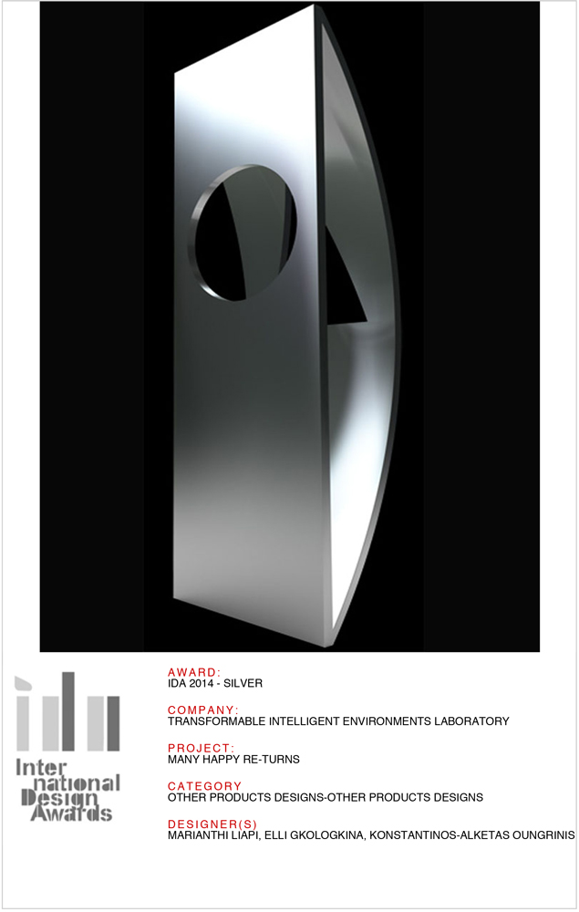 Marianthi Liapi (Research Associate at the TUC Transformable Intelligent Environments laboratory), Elli Gkologkina (graduate of the Department of Architectural Engineering-TUC) and KonstantinosAlketas Oungrinis (Assistant Professor in Architectural Design and Innovative Engineering-TUC) are the IDA 14 - Silver Winners under the Products Designs Category for their Many Happy reTurns Project. Many Happy re-Turns is a leading project of the Educational Playscapes research direction at the Transformable Intelligent Environments Lab in the Technical University of Crete.