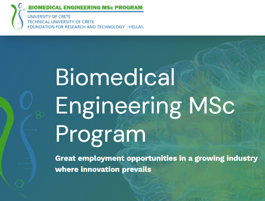The School of Medicine, the Department of Computer Science, the Department of Materials Science and Engineering of the University of Crete (UoC), the School of Electrical and Computer Engineering of the Technical University of Crete (TUC), and the Foundation for Research and Technology - Hellas (FORTH) announce that applications for the academic year 2024-2025 for the Joint Master's Program in "Biomedical Engineering" are now open!