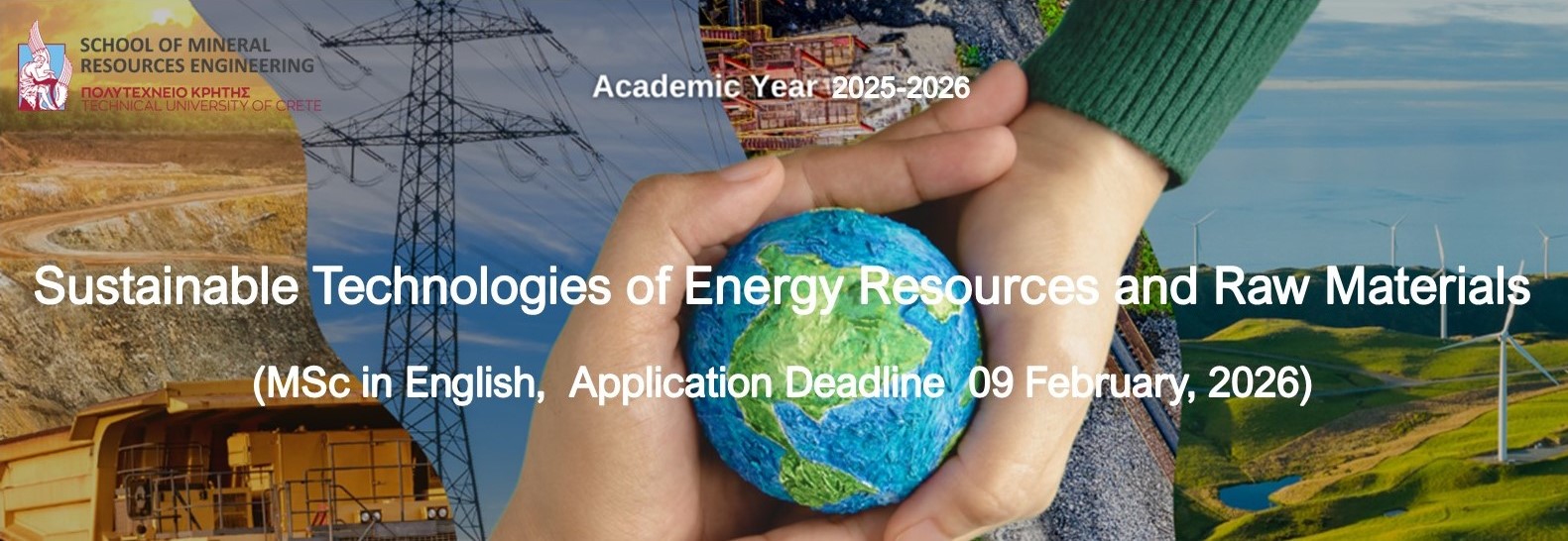 The School of Mineral Resources Engineering of the Technical University of Crete is now accepting applications for the Postgraduate Studies Programme - Master of Science (MSc) titled "Sustainable Technologies of Energy Resources and Raw Materials".