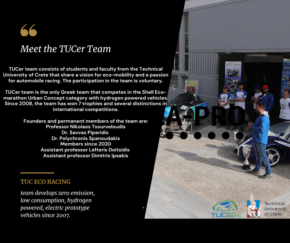 TUCer (Technical University of Crete eco racing) team develops zero emission, low consumption, hydrogen powered, electric prototype vehicles since 2007. The team consists of students and faculty from the Technical University of Crete who share a vision for eco-mobility and a passion for automobile racing. Participation in the team is totally voluntary. TUCer team has won several awards at international low consumption competitions.