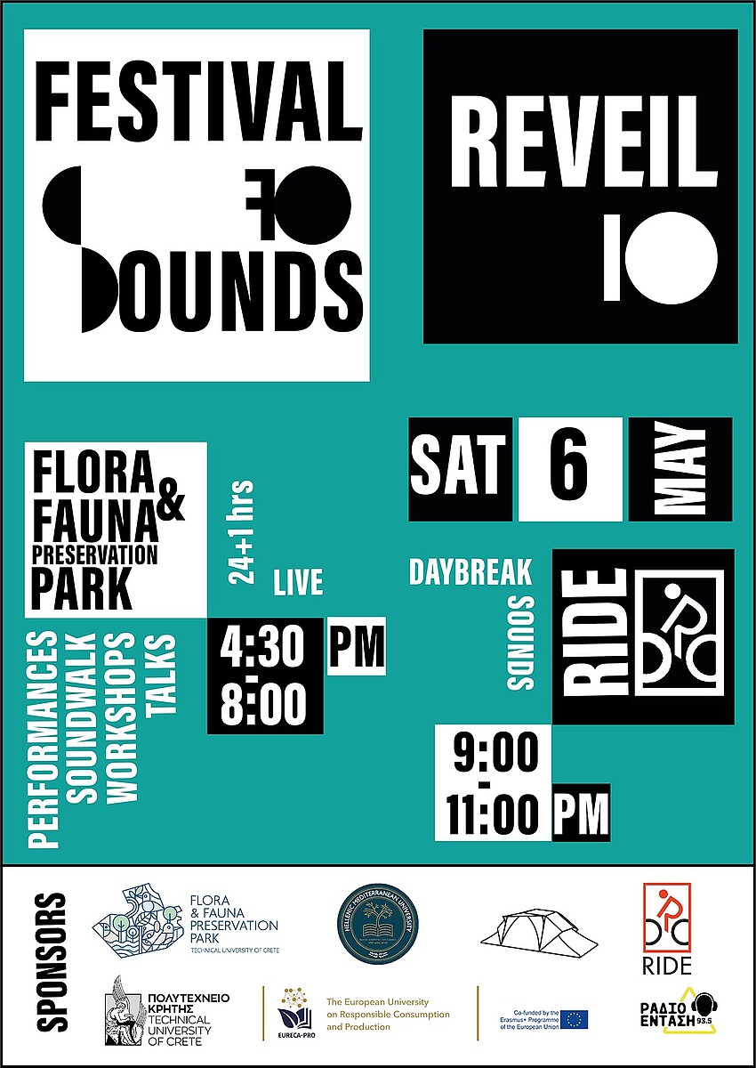 The Reveil Sound and Ecology Festival, organized by the international artistic group Soundcamp Cooperative, returns with its tenth (10th) anniversary edition on May 6 and 7, 2023 with parallel events in various cities in Europe, the United Kingdom of England, America and of Canada. On Saturday, May 6, 2023, a series of actions will be presented in Chania that will be part of the Reveil Festival and will be hosted in two parts of the city with free entrance for the public: (a) the Flora and Fauna Preservation Park of the Technical University of Crete from 16:30 until 20:00 and (b) the RIDE café bar in the old port of Chania from 21:00 until 23:00. This year's program has been arranged by Dr. Maria-Eftychia Papadomanolaki, founding member of Soundcamp Cooperative. Additional information may be found on the Facebook Event.