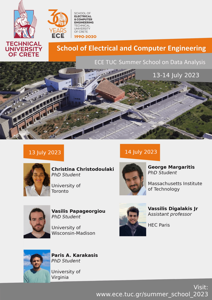 Keeping up with the tradition of recent years, the School of Electrical and Computer Engineering (ECE) of the Technical University of Crete (TUC) is organizing this year the 2023 ECE TUC Summer School on Data Analysis, which will take place on Thursday 13 and Friday 14 July 2023 from 16:00 to 20:30. The Summer School will be held at the "Manousos Manousakis" Amphitheater (Γ2.1) on TUC Campus, but at the same time online participation via teleconference will be available, as well as the option of watching via live stream.