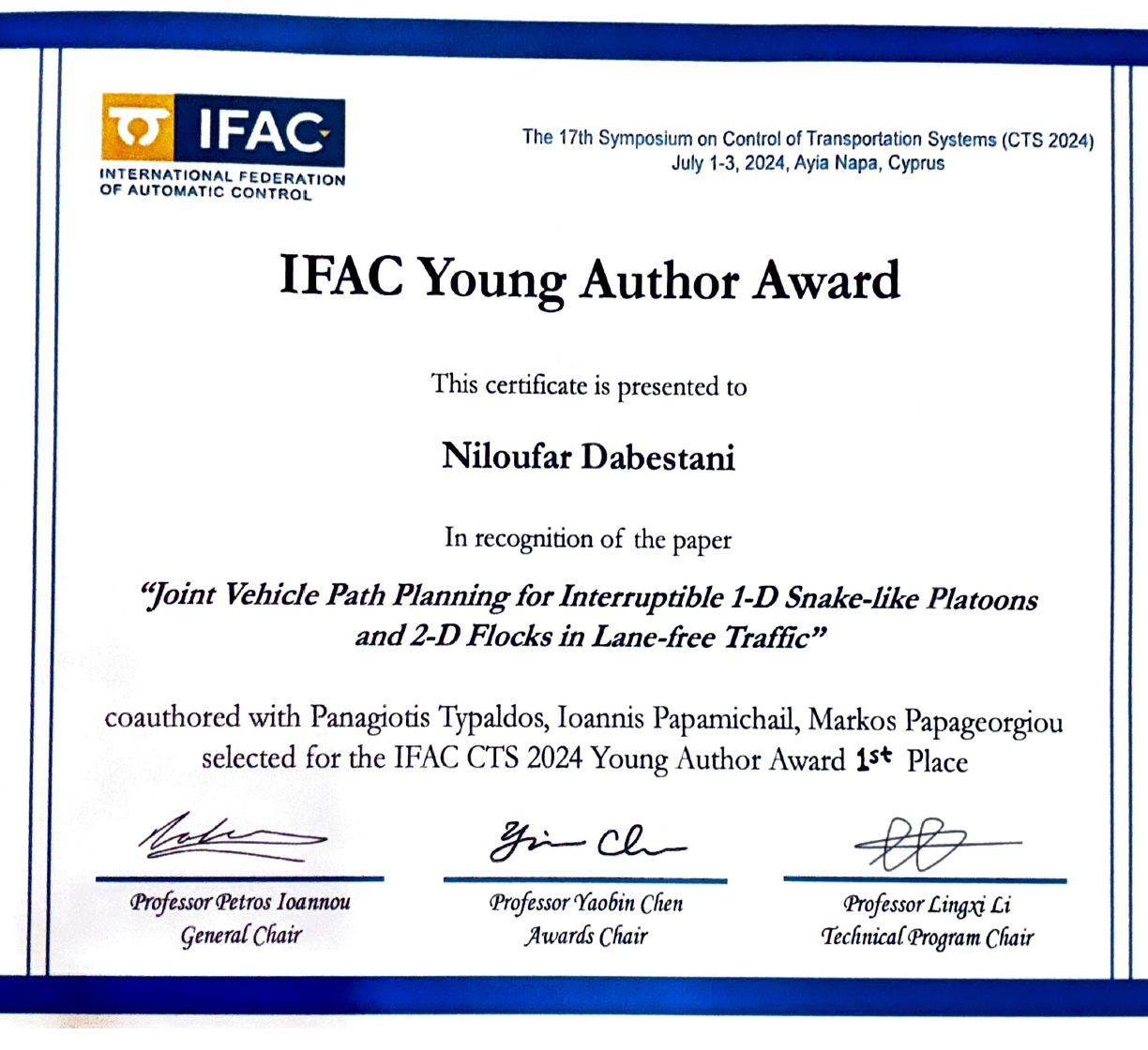 The paper was presented at and was published in the Proceedings of the 17th IFAC Symposium on Control in Transportation Systems (CTS 2024), held in Ayia Napa, Cyprus, July 1-3, 2024. The award was presented to Niloufar Dabestani on Tuesday, July 2, 2024, during the Conference banquet.