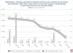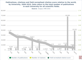 With regard to the 5-year period 2006-2010, Figures 4.3.1 and 4.3.2* display the number of publications and citations as well as the relevant “field-normalised citation score” for each University. The field normalised citation score or “citation score” is the relative number of citations to publications of a University compared to the world average of citations to publications of the same time period and scientific subject field. The normalisation was done on an individual article level according to the 329 scientific subject fields. If an article was originating in more than one scientific fields, a mean value of the fields was calculated. The citation score was calculated using software developed by the National Documentation Centre (EKT). A value greater than 1, indicated that the impact of publications was higher than the world average.
