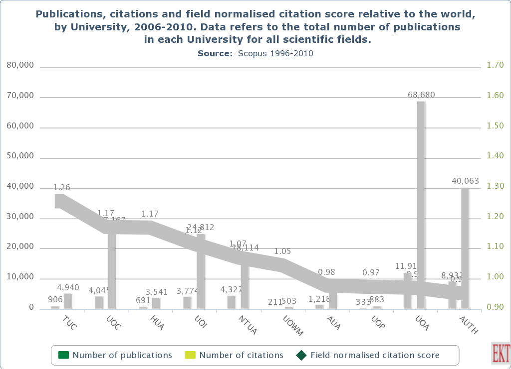 As far as TUC is concerned, this study reflects the performance of TUC scientific staff and its production of scientific publications as well as the impact of the TUC's research work internationally. TUC ranks first among all universities in Greece in research publications marking the highest citation score and exceeding world average!