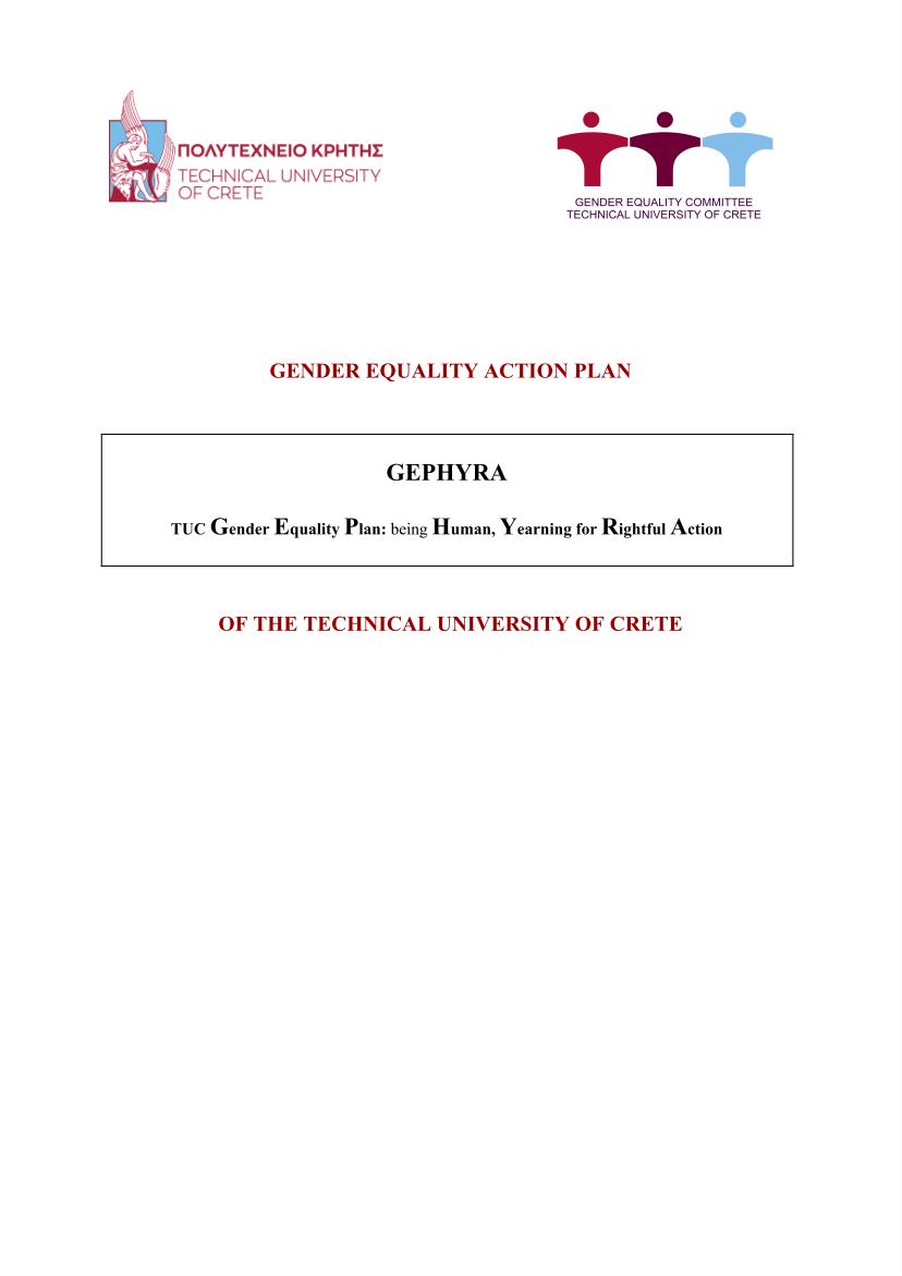 The Action Plan for Gender Equality of the Technical University of Crete for the years 2022-2025 was authored by the Gender Equality Committee and was approved at the 599th/29.07.2022 meeting of the Senate of the Technical University of Crete. The acronym GEPHYRA comes from the initials of the title "Gender Equality Plan: being Human, Yearning for Rightful Action".