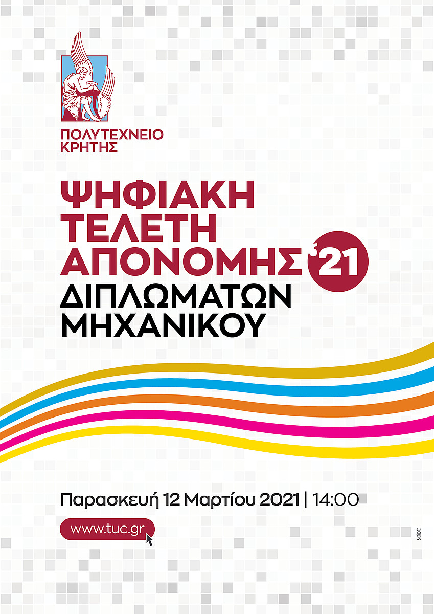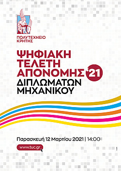 Η Τελετή Απονομής Διπλωμάτων Μηχανικού του Πολυτεχνείου Κρήτης για την ανακήρυξη της εξεταστικής, χειμερινού εξαμήνου 2020-2021, θα πραγματοποιηθεί με τηλεδιάσκεψη την Παρασκευή 12 Μαρτίου 2021 και ώρα 14:00.